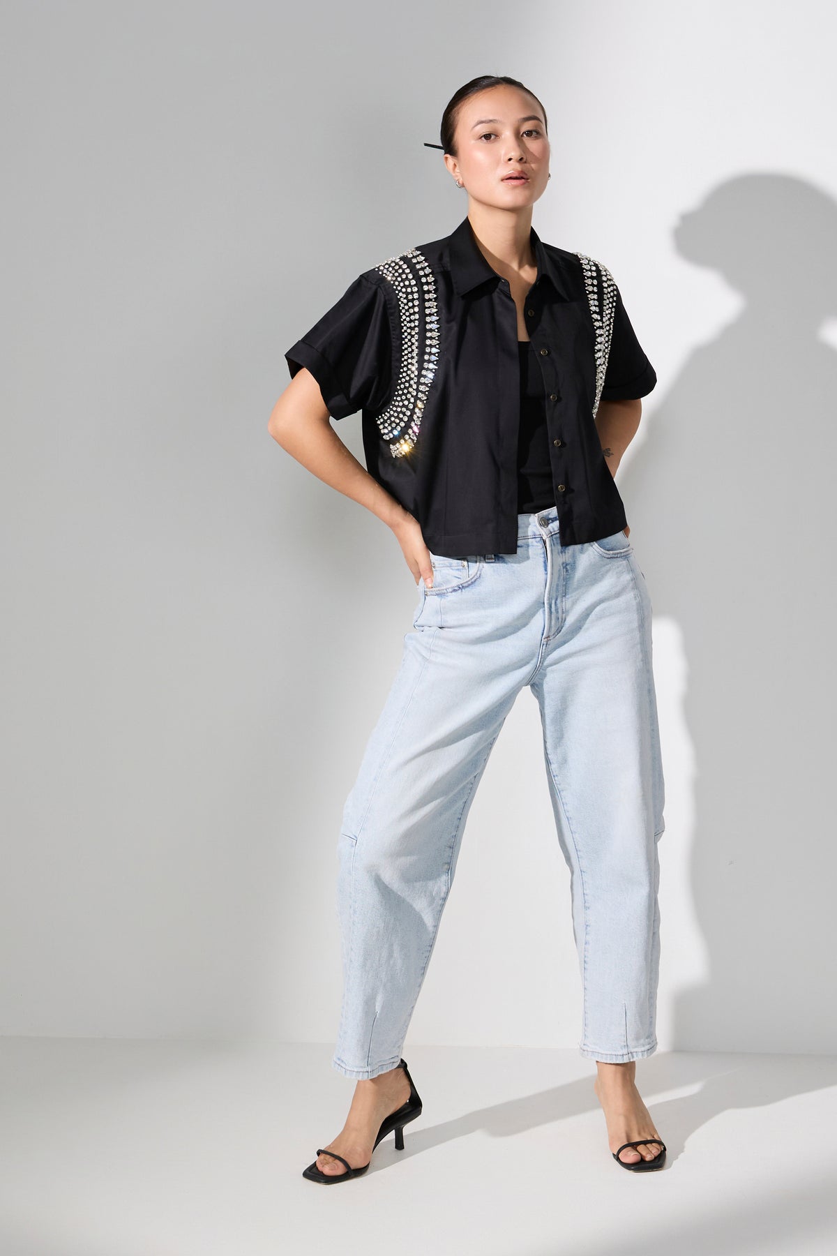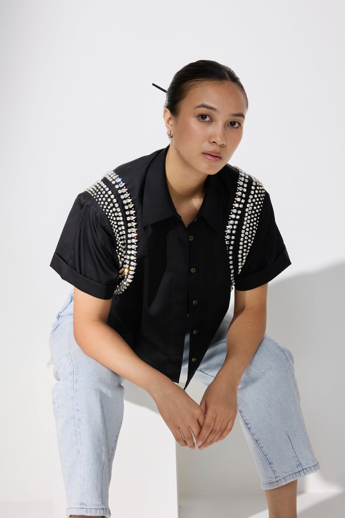 Refined and effortlessly chic, this shirt features a Classic Collar and Half Sleeves, offering a timeless and sophisticated silhouette. The highlight of this piece is its exquisite shoulder embroidery, which gracefully transitions into a delicate, crystal-encrusted fade-out effect, creating an ethereal and opulent look.