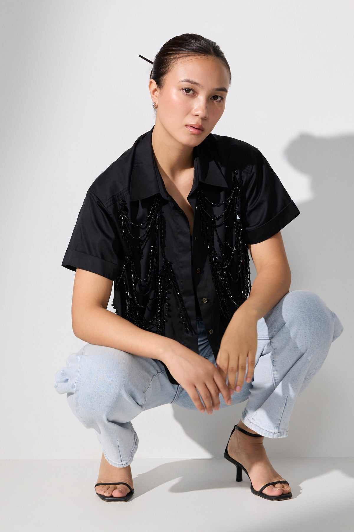 The Fringe Panel Shirt is a breezy piece. Its relaxed fit and classic collar offer comfort and style, The half sleeves are perfect for warmer weather, and the embellished front panel with delicate fringe creates a striking focal point.