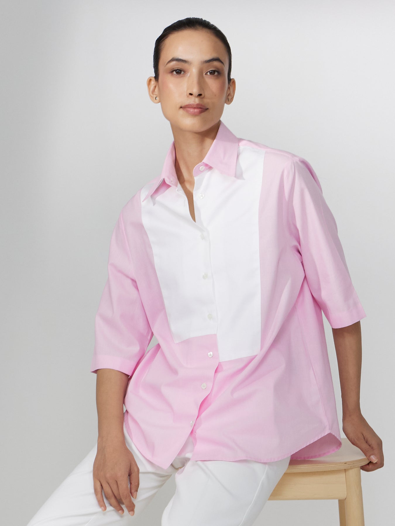 Elevate your wardrobe with this artfully tailored shirt, defined by its architectural two-tone panelling. The sharp white contrasts and clean geometric lines create a statement in minimalism. Featuring a front-open silhouette with elbow-length sleeves, this piece balances simplicity with structure—perfect for effortless everyday styling.