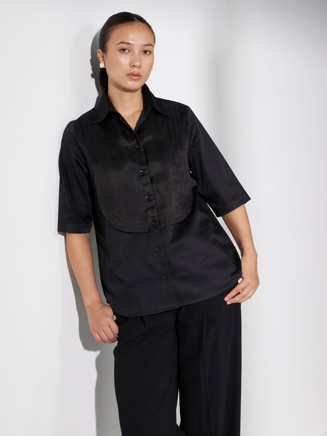 Tailored in lustrous Pima cotton, this shirt is elevated with a sheer organza bib, distinguished by three fine stitch-line details that highlight its architectural precision. The elbow-length sleeves lend modern proportion, while the interplay of opaque satin and translucent organza creates a refined contrast. A contemporary expression of structure and softness, this piece embodies timeless luxury with couture subtlety.