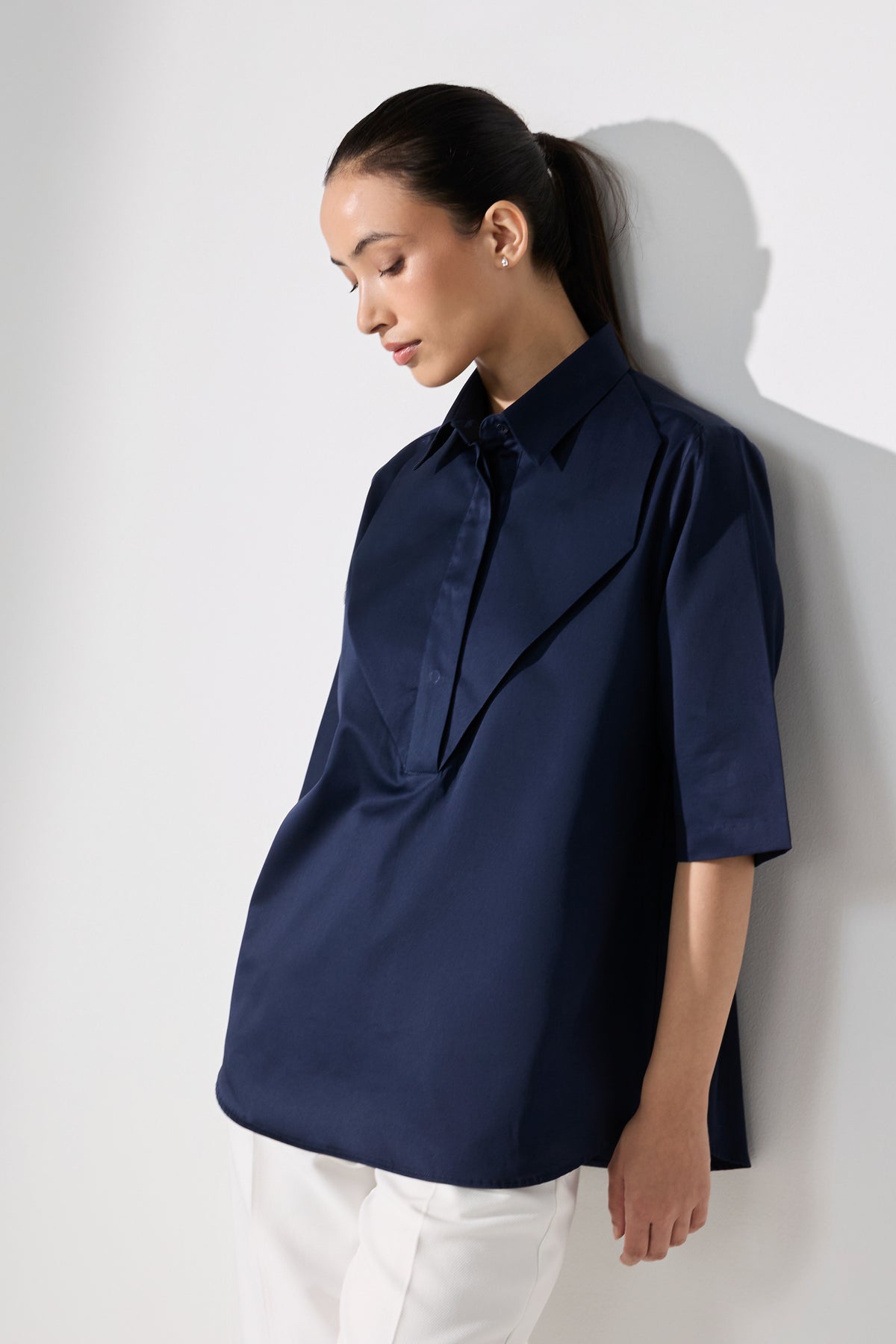 Tailored in lustrous Pima cotton, this Navy shirt is elevated with a sheer organza bib, distinguished by three fine stitch-line details that highlight its architectural precision. The elbow-length sleeves lend modern proportion, while the interplay of opaque satin and translucent organza creates a refined contrast. A contemporary expression of structure and softness, this piece embodies timeless luxury with couture subtlety.