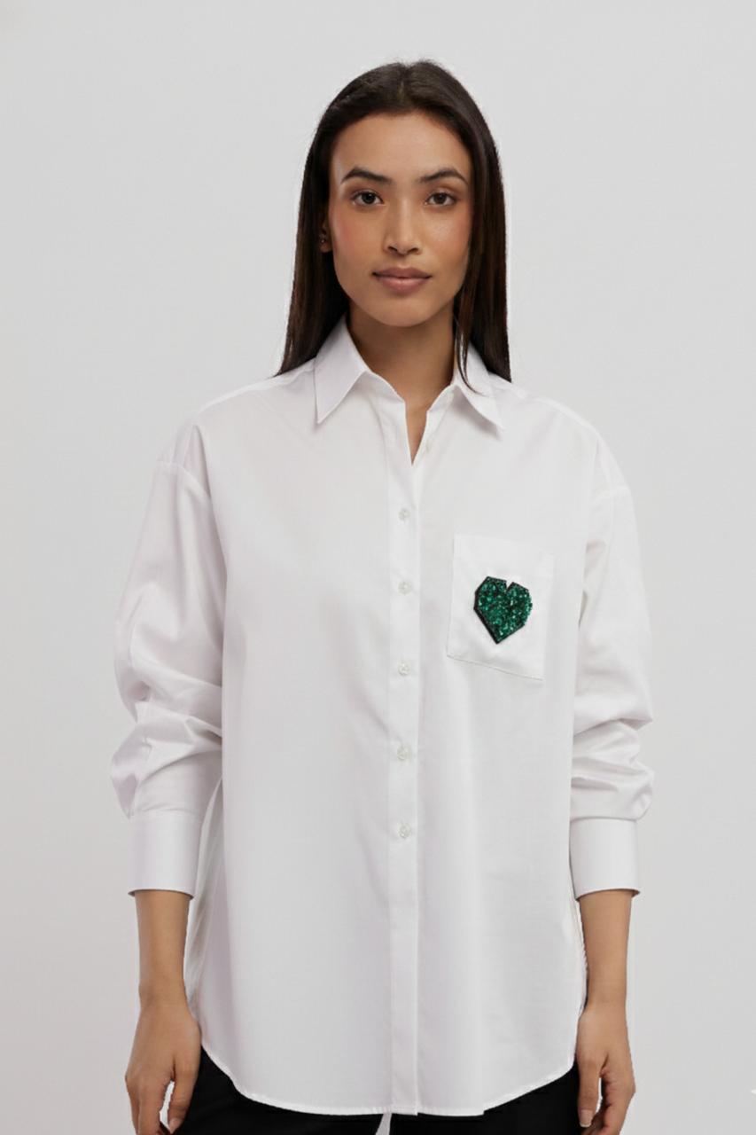 Refined elegance meets modern design in this relaxed fit shirt,crafted for effortless sophistication.A true standout feature is the embellished chest pocket, adorned with a emerald diamond heart, adding a touch of luxury and charm.