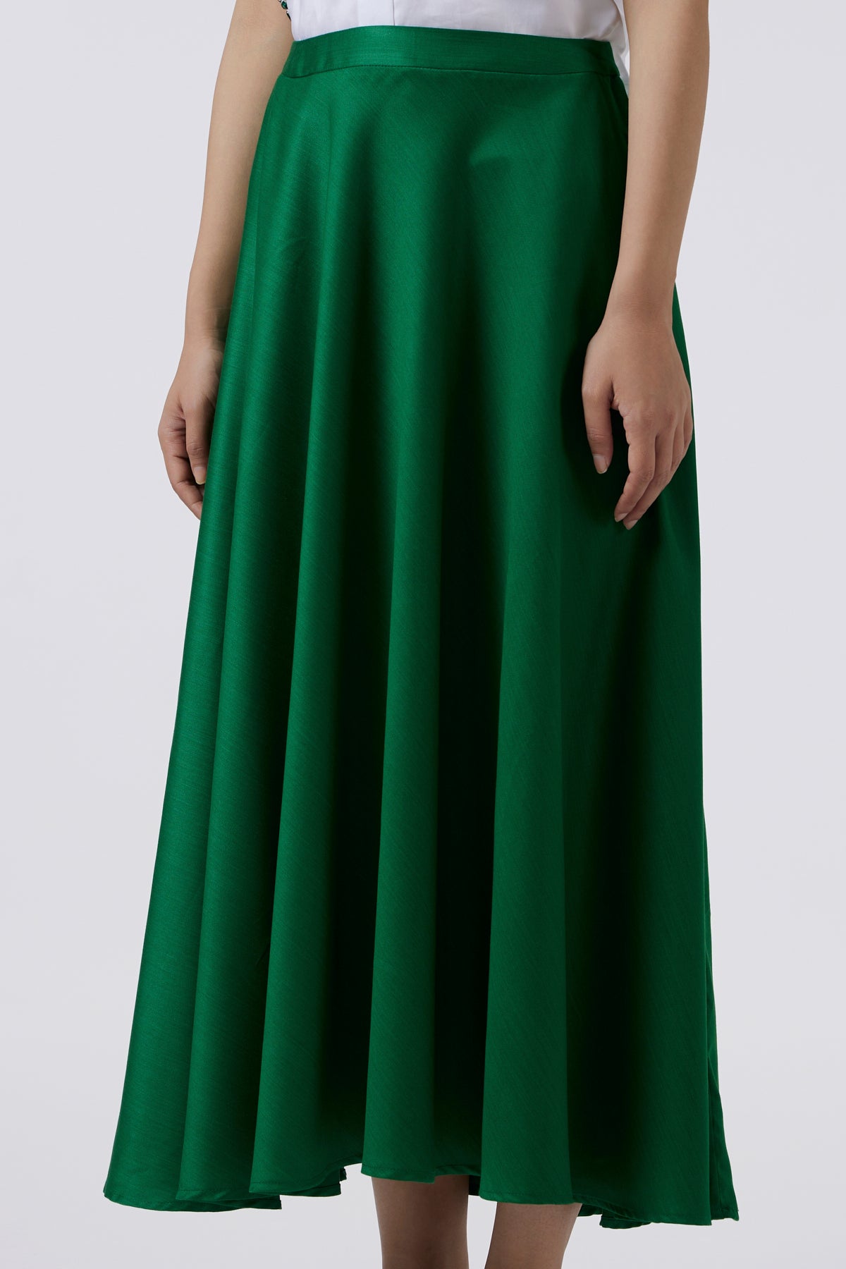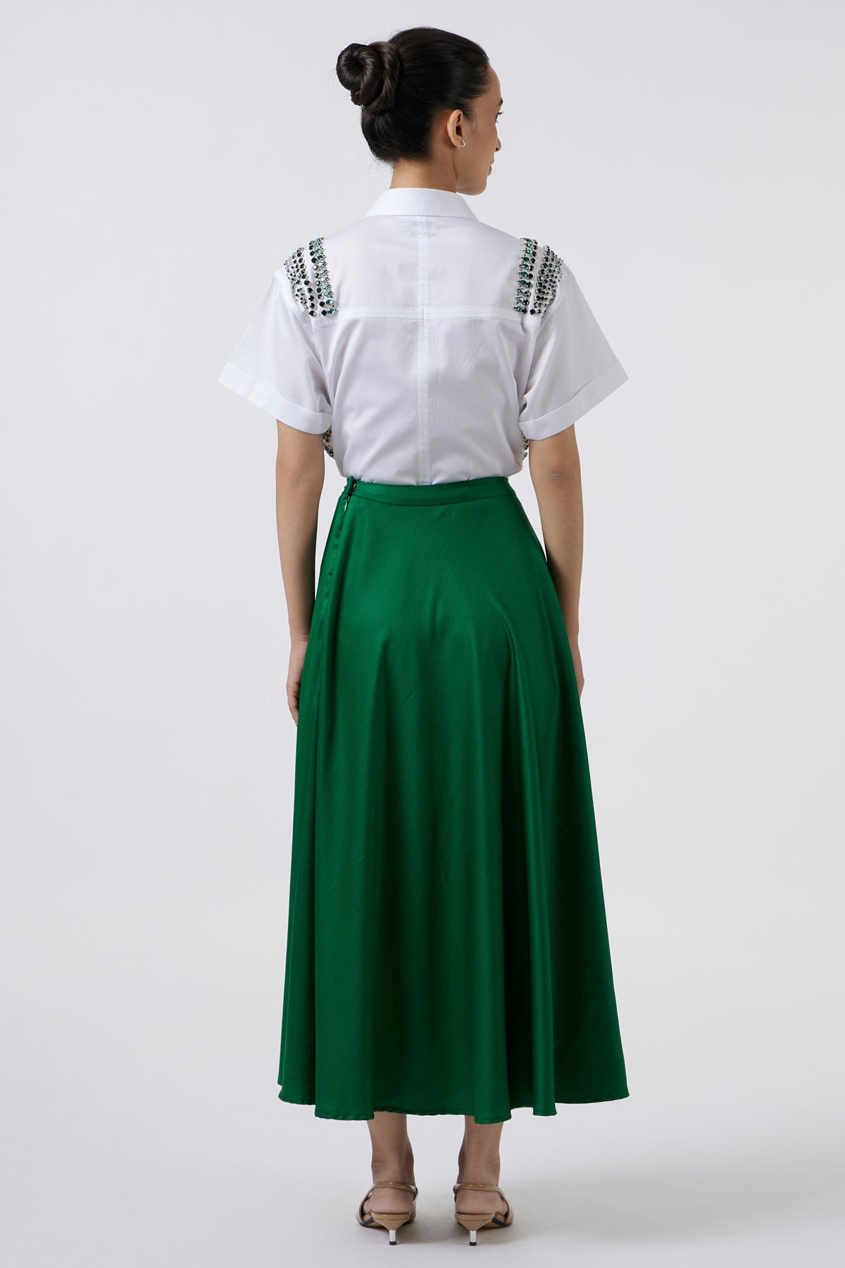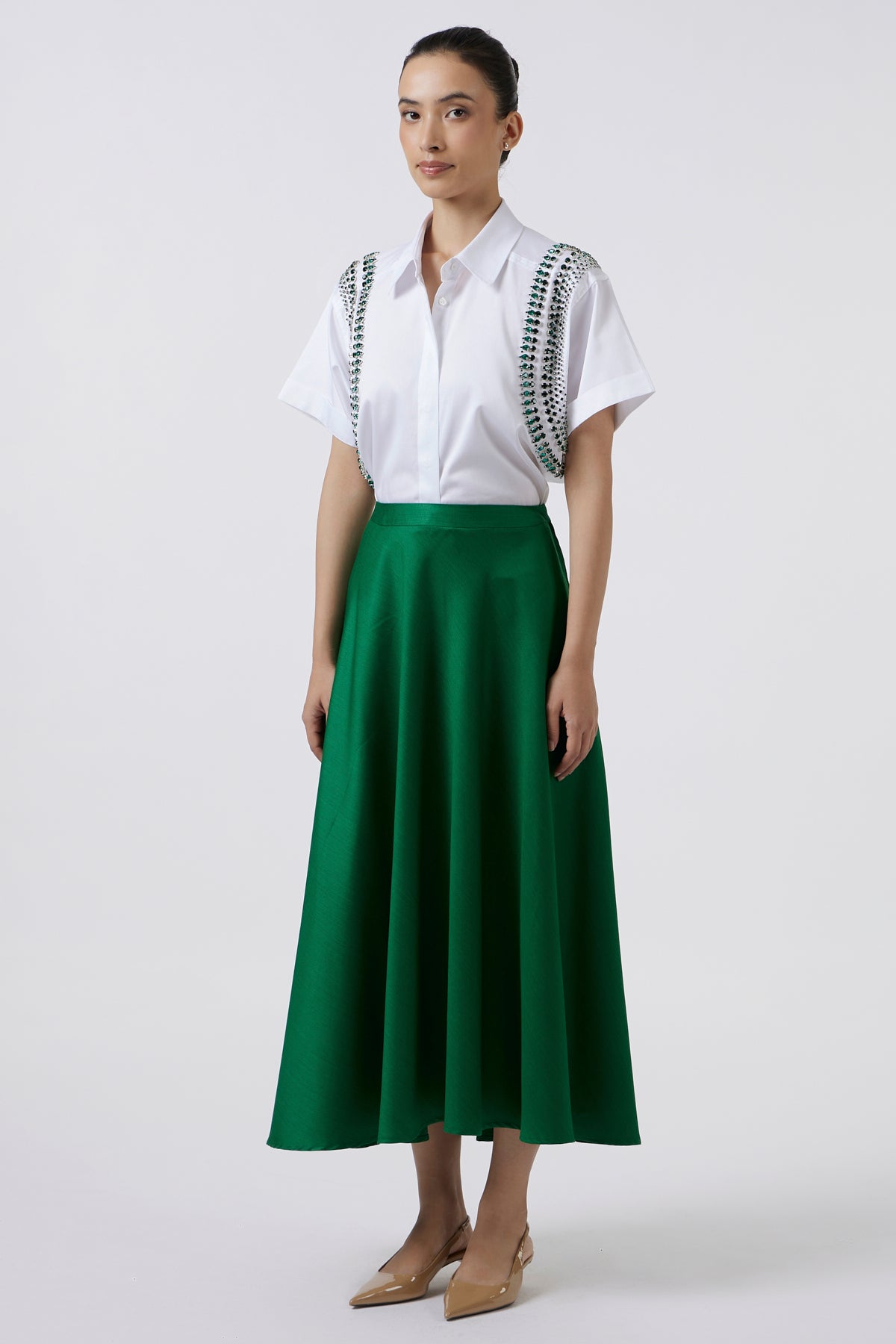 Elegant and versatile, this flared skirt is crafted in Pima cotton blend that offers a gentle sheen and fluid drape. Designed with a flattering high-waist silhouette and a smooth side zip closure, it moves effortlessly with every step. A timeless piece that pairs seamlessly with both structured tops and relaxed blouses, making it a wardrobe essential for day-to-evening dressing.