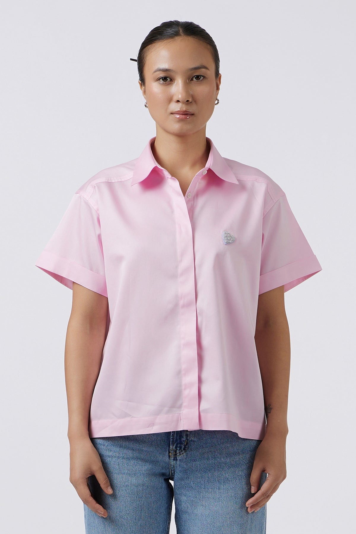 This refined crop shirt is made from ultra-soft Pima cotton. It features a relaxed fit, classic collar, Half sleeves, and a pearl heart detail.