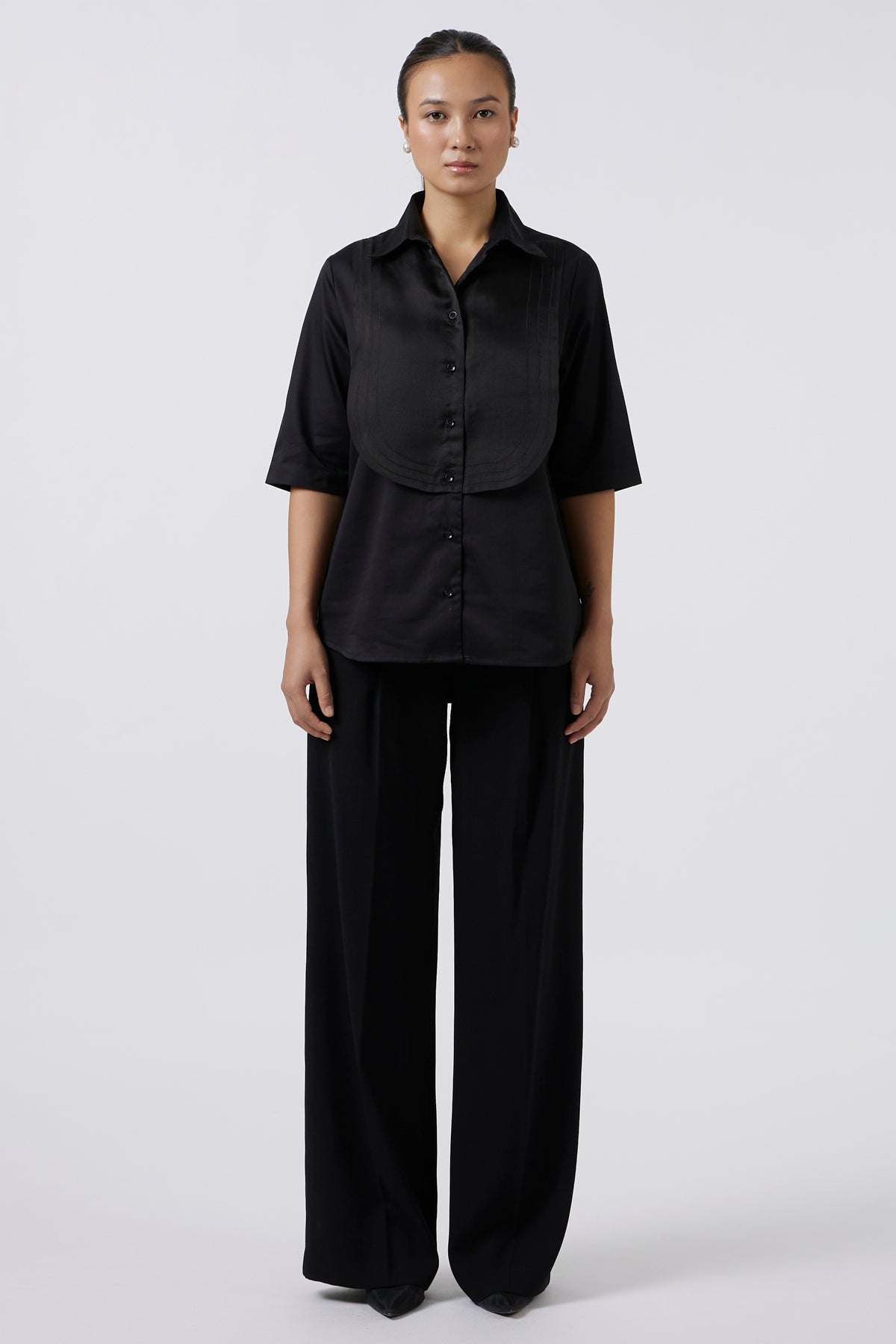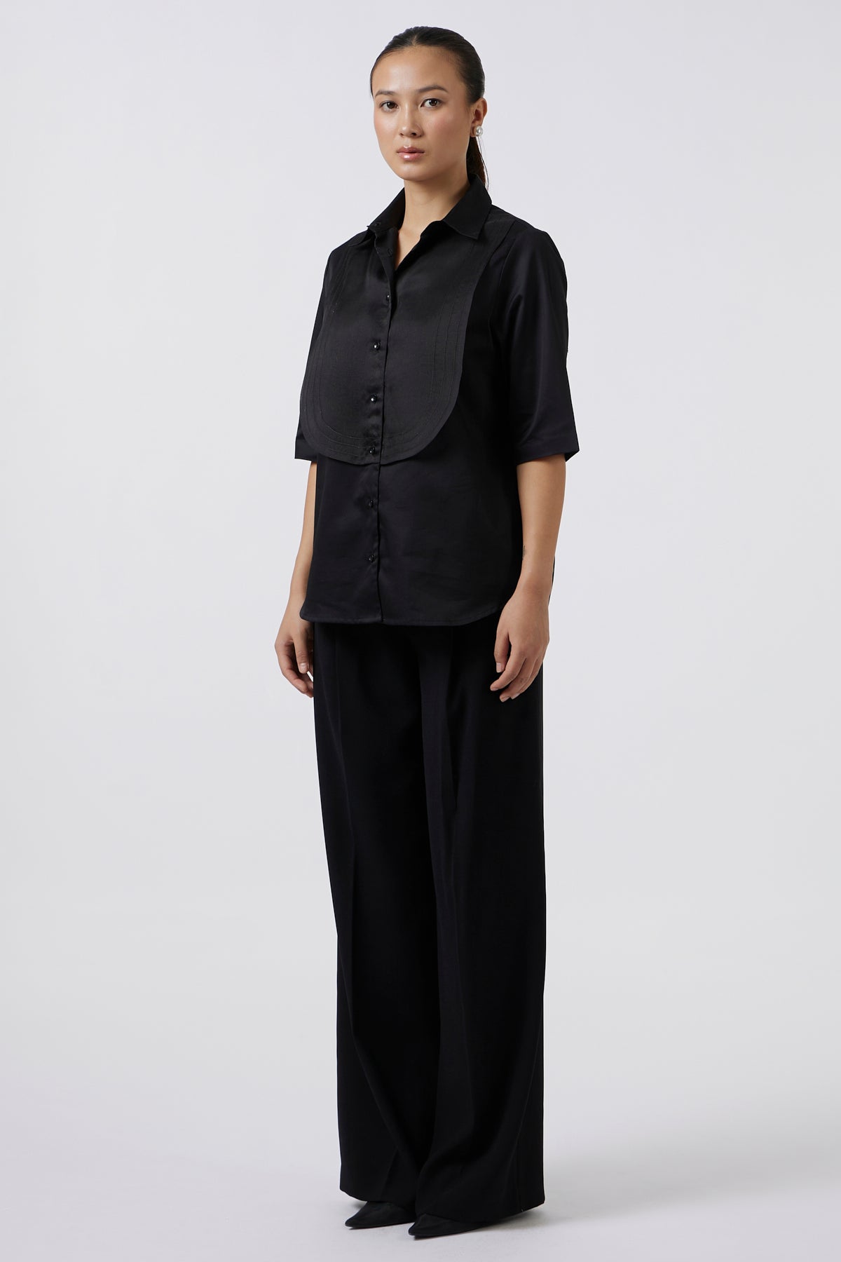 Tailored in lustrous Pima cotton, this shirt is elevated with a sheer organza bib, distinguished by three fine stitch-line details that highlight its architectural precision. The elbow-length sleeves lend modern proportion, while the interplay of opaque satin and translucent organza creates a refined contrast. A contemporary expression of structure and softness, this piece embodies timeless luxury with couture subtlety.
