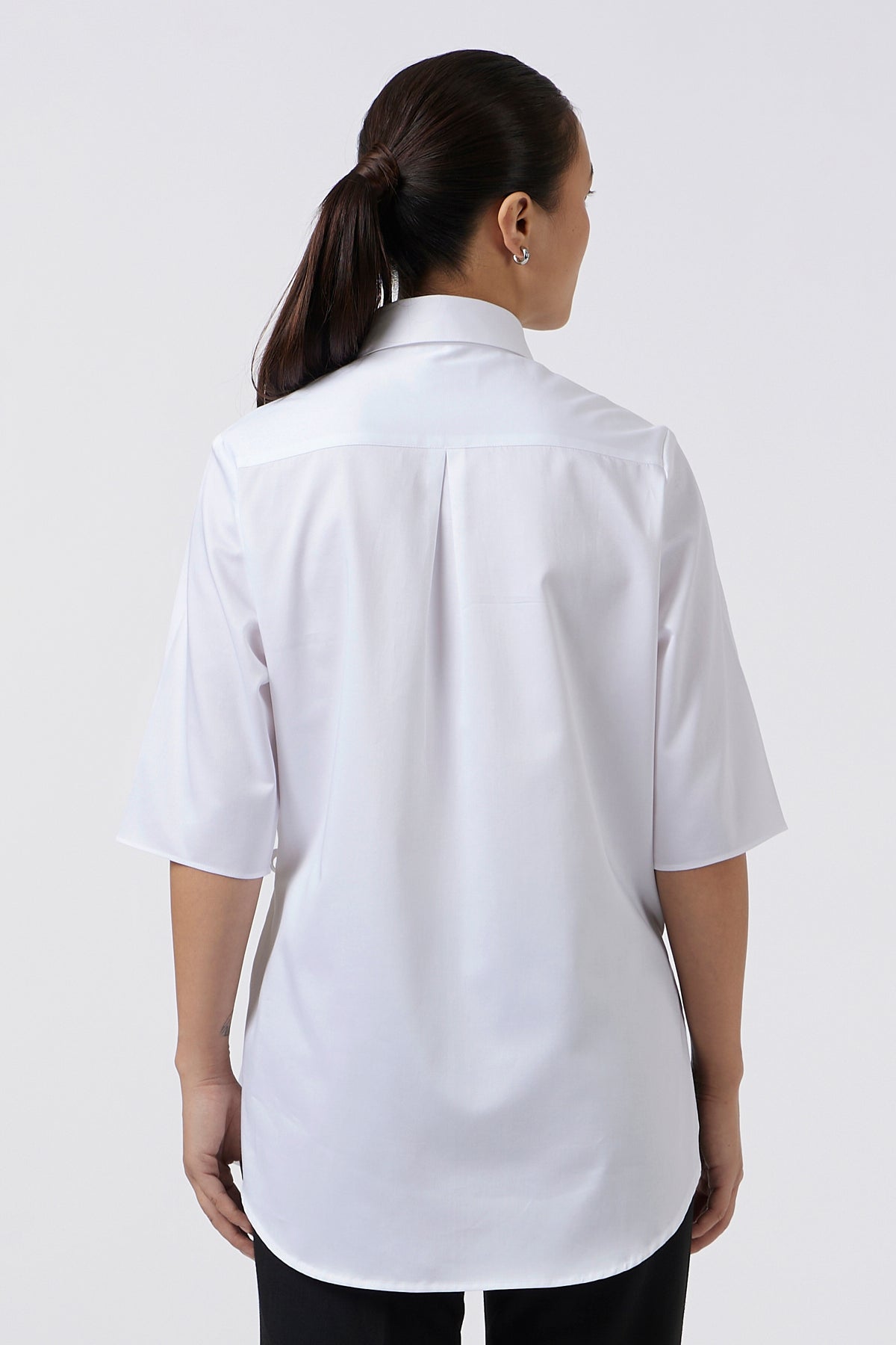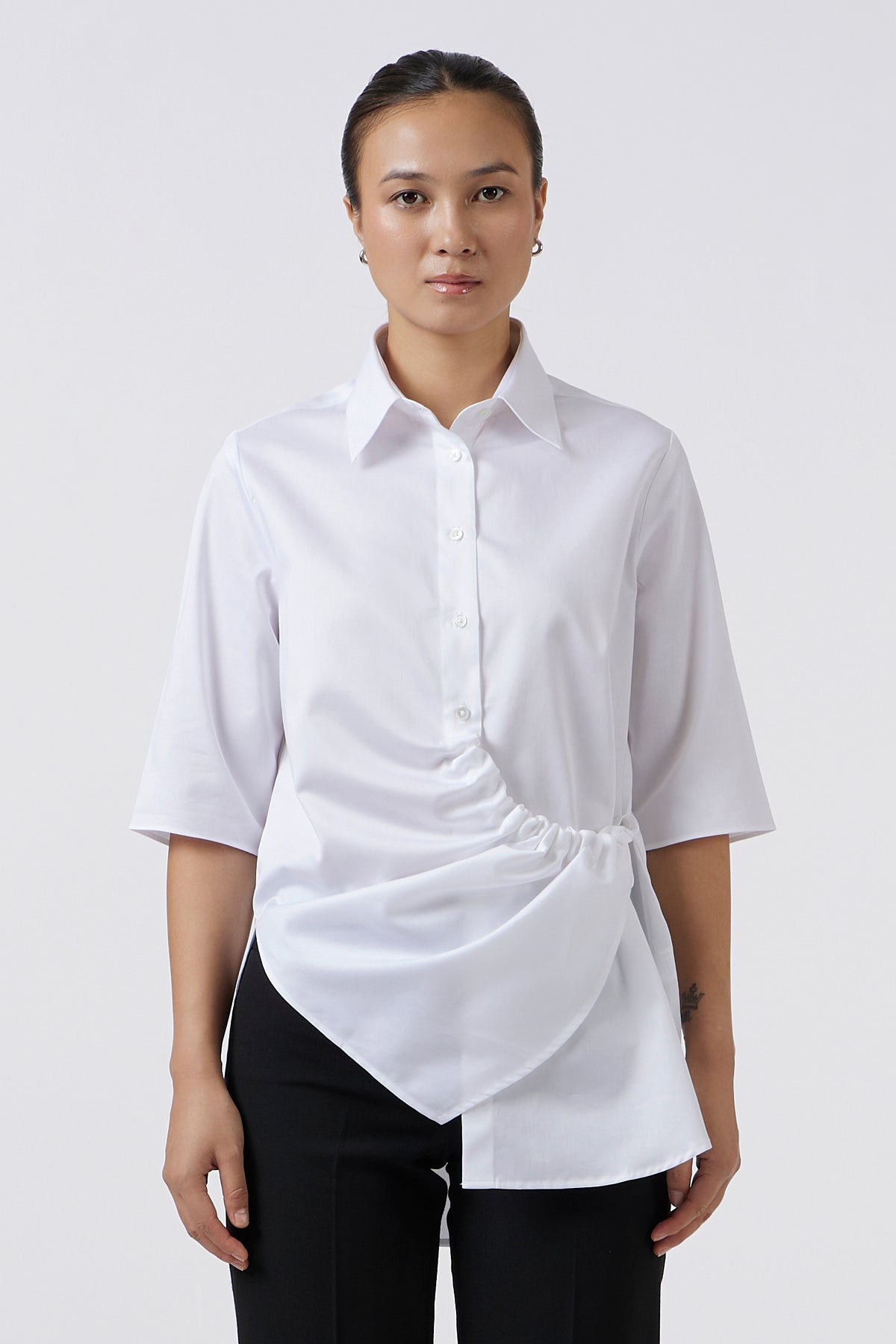 Crafted in rich Pima Cotton, this white shirt celebrates structure and form. The standout architectural bib creates a sculptural dimension, Elbow length sleeves and a classic collar refine the silhouette. A harmony of bold design and fluid fabric, it is elegance reimagined through structure.