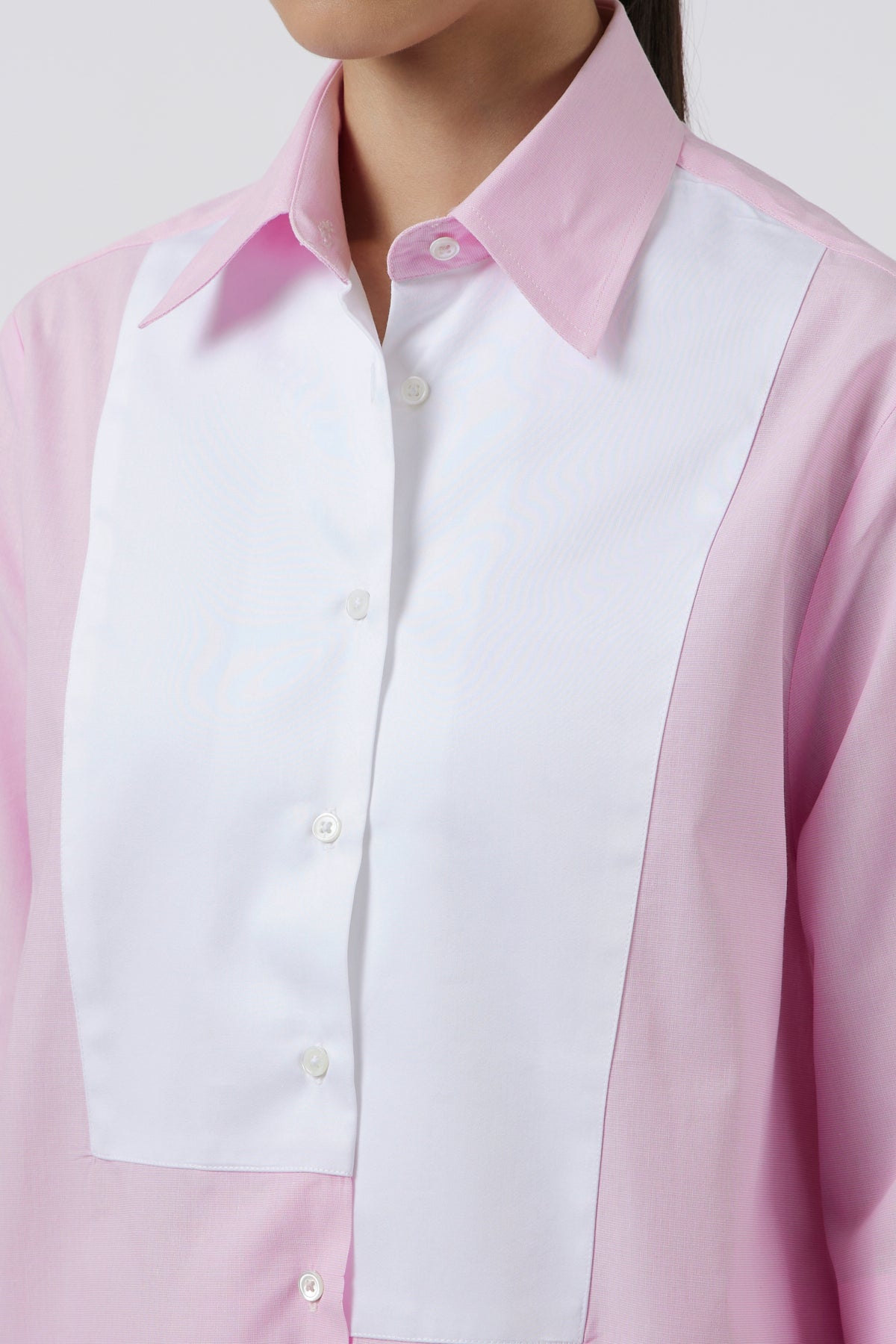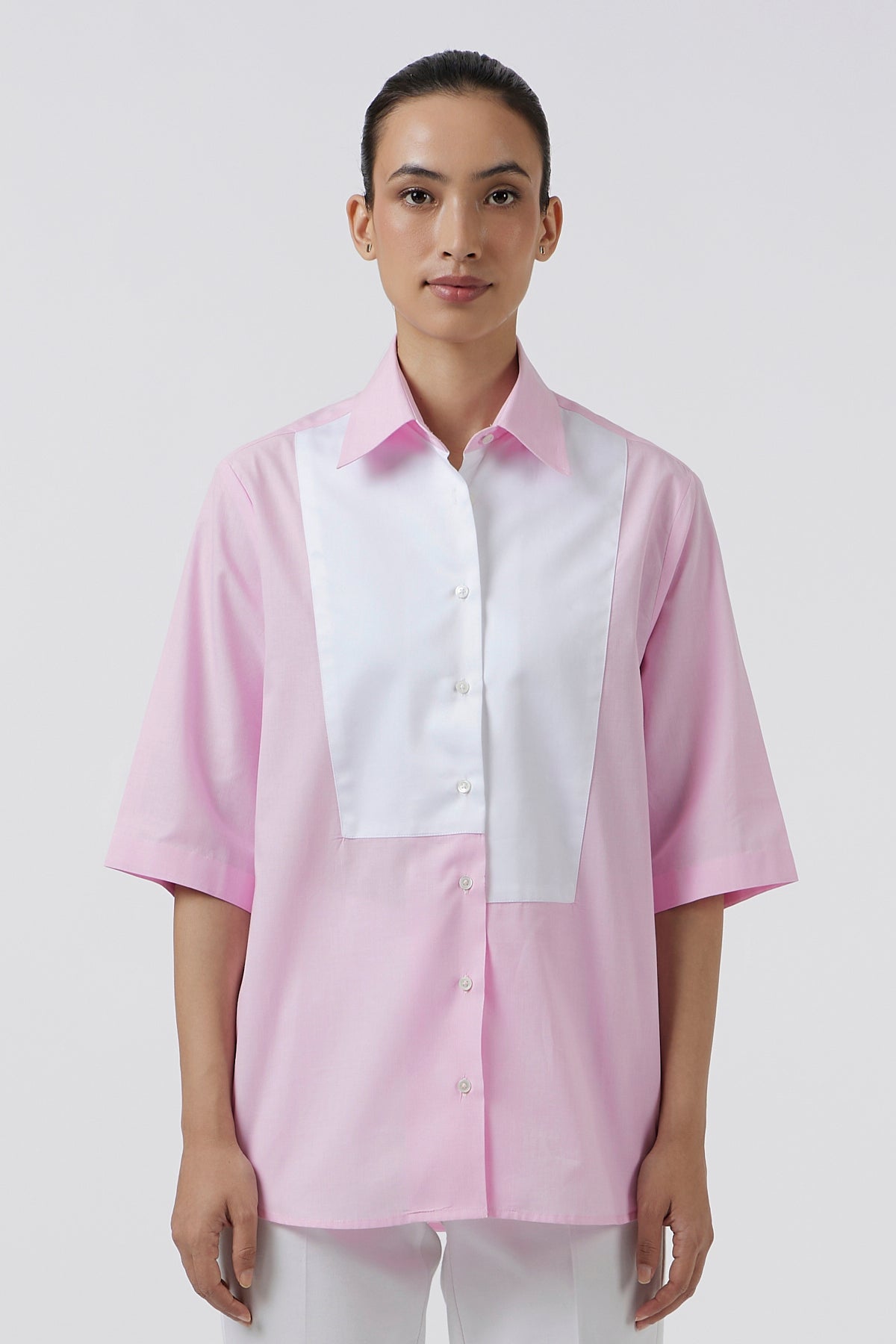 Elevate your wardrobe with this artfully tailored shirt, defined by its architectural two-tone panelling. The sharp white contrasts and clean geometric lines create a statement in minimalism. Featuring a front-open silhouette with elbow-length sleeves, this piece balances simplicity with structure—perfect for effortless everyday styling.
