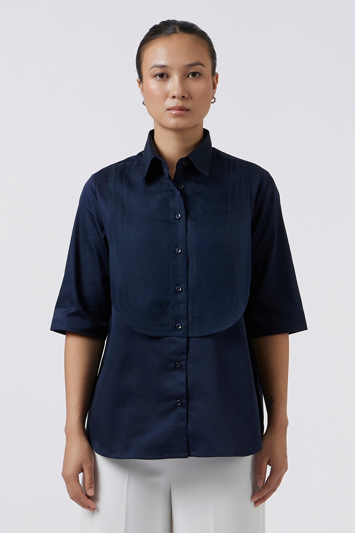 Tailored in lustrous Pima cotton, this Navy shirt is elevated with a sheer organza bib, distinguished by three fine stitch-line details that highlight its architectural precision. The elbow-length sleeves lend modern proportion, while the interplay of opaque satin and translucent organza creates a refined contrast. A contemporary expression of structure and softness, this piece embodies timeless luxury with couture subtlety.
