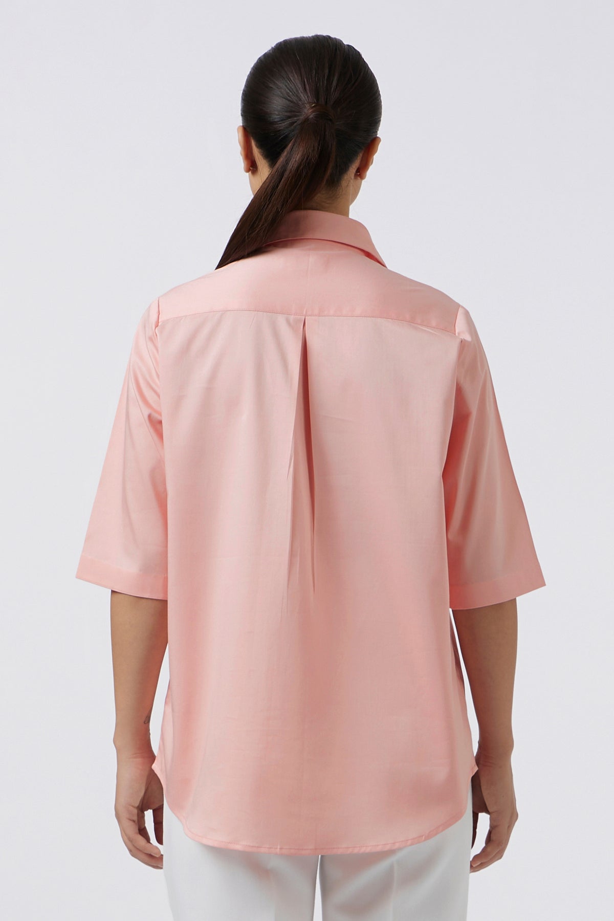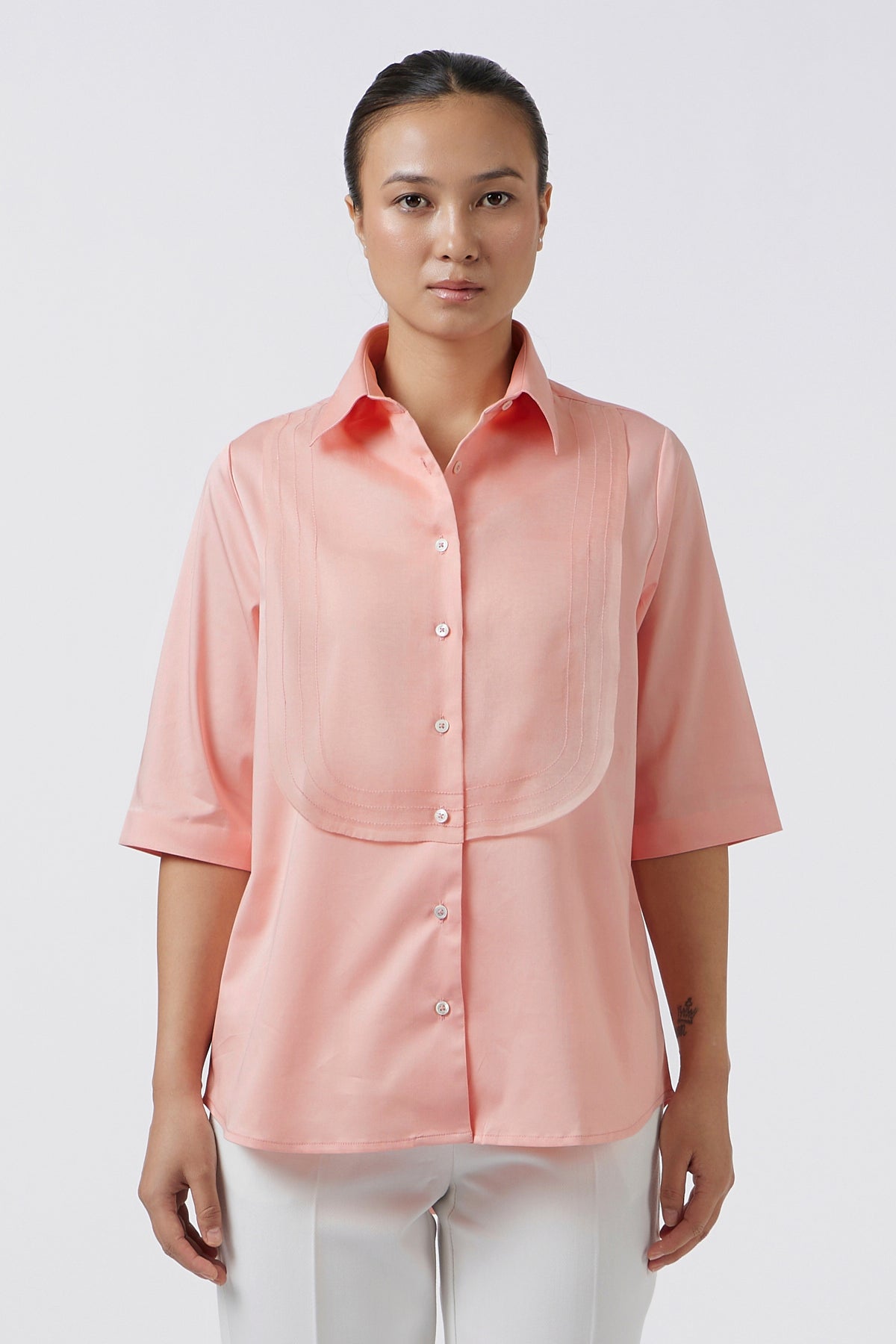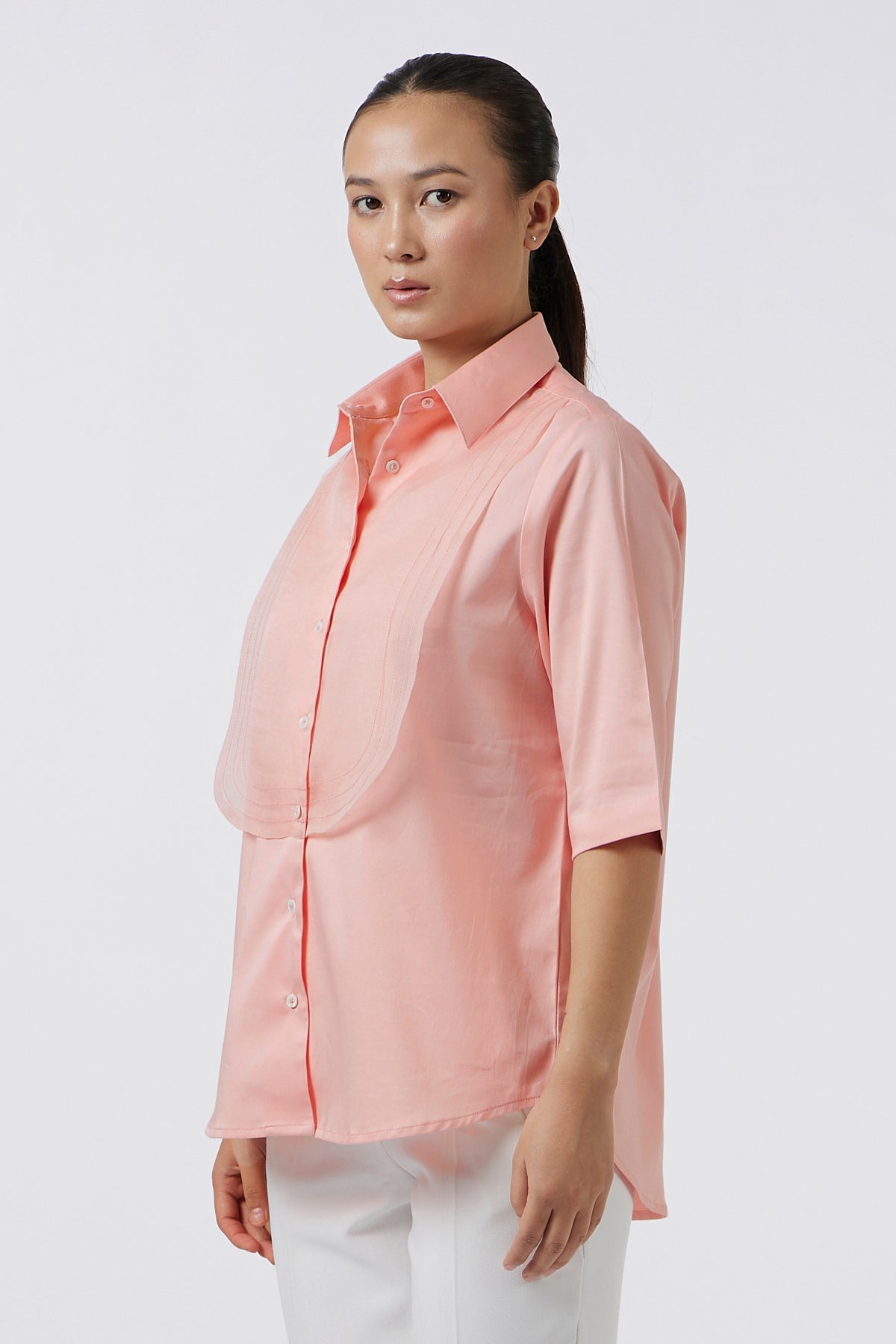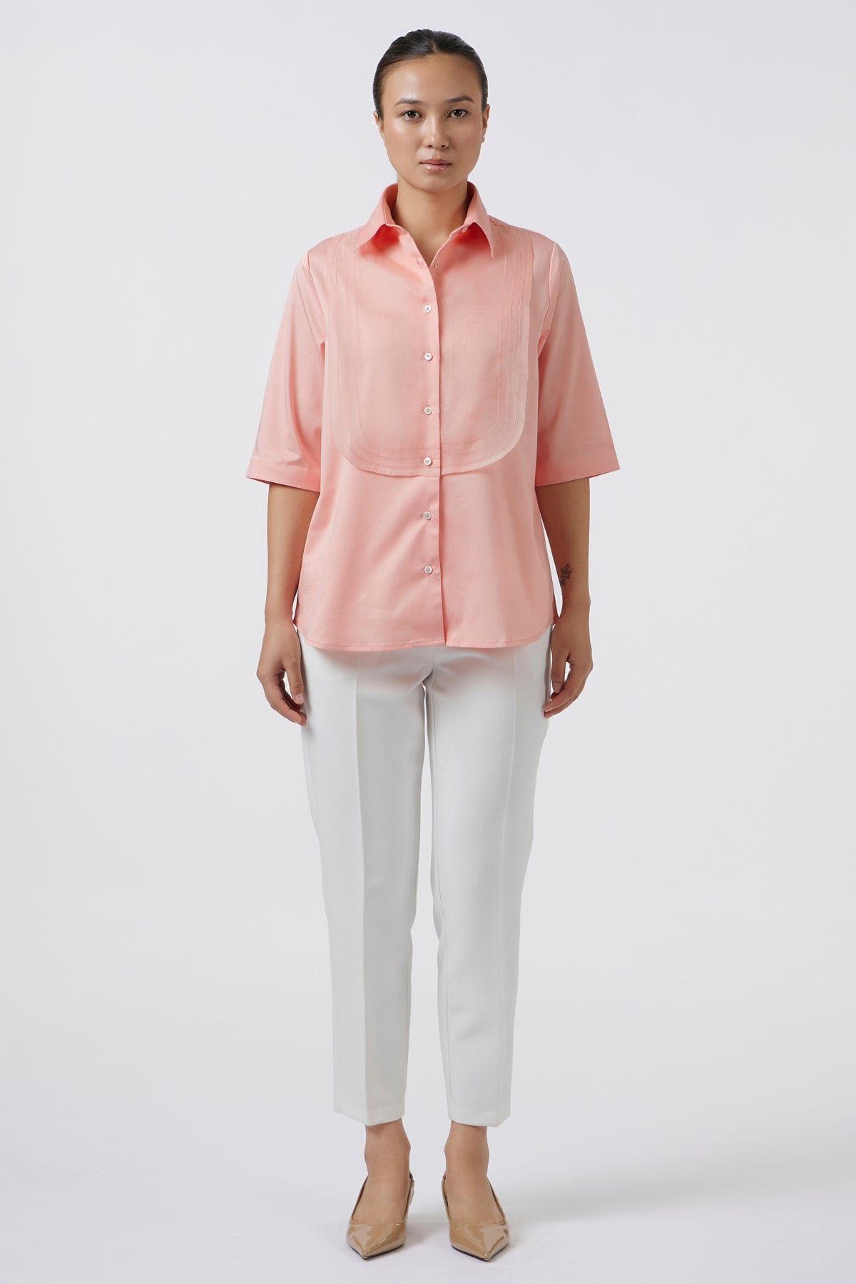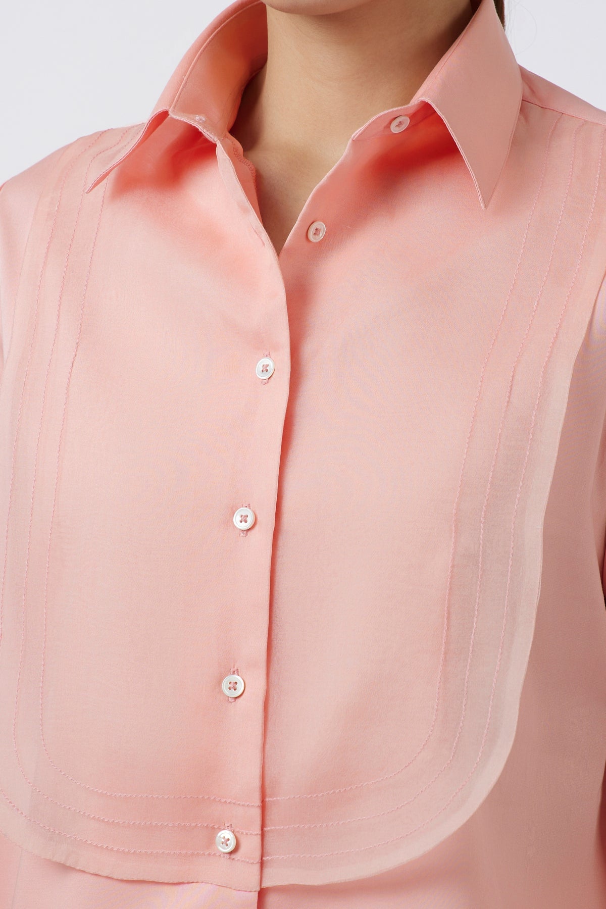 Tailored in lustrous Pima cotton, this shirt is elevated with a sheer organza bib, distinguished by three fine stitch-line details that highlight its architectural precision. The elbow-length sleeves lend modern proportion, while the interplay of opaque satin and translucent organza creates a refined contrast. A contemporary expression of structure and softness, this piece embodies timeless luxury with couture subtlety.
