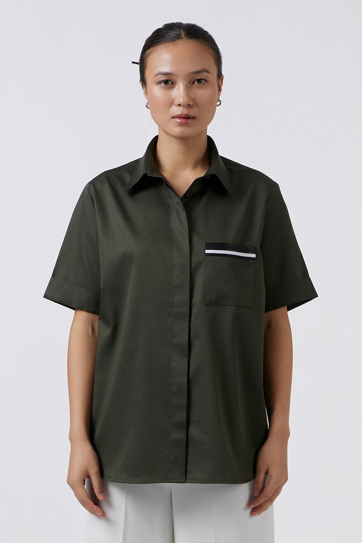 The olive Strip Pocket Shirt is a modern twist on a classic design. Its relaxed fit and classic collar offer comfort and style, while the concealed button placket maintains a sleek silhouette. Half sleeves & chest pocket with contrast ribbon