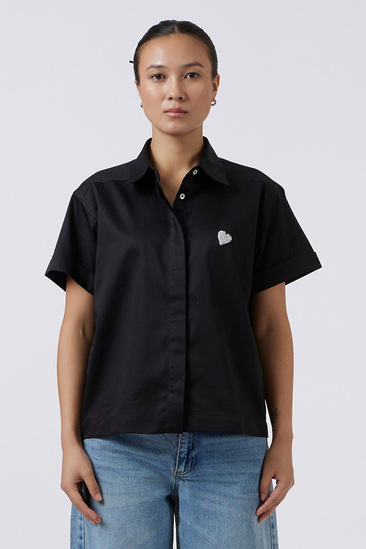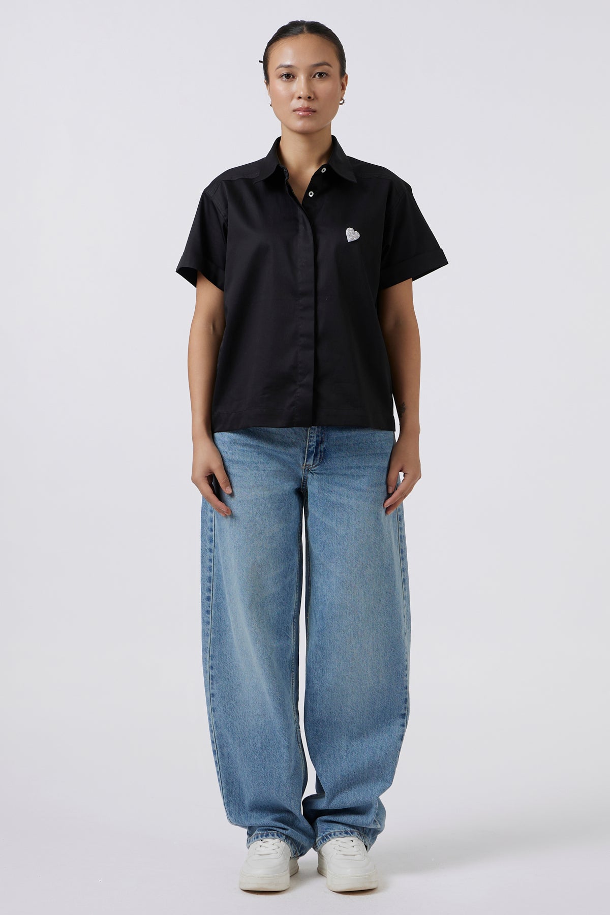 This refined crop shirt is made from ultra-soft Pima cotton. It features a relaxed fit, classic collar, Half sleeves, and a pearl heart detail.