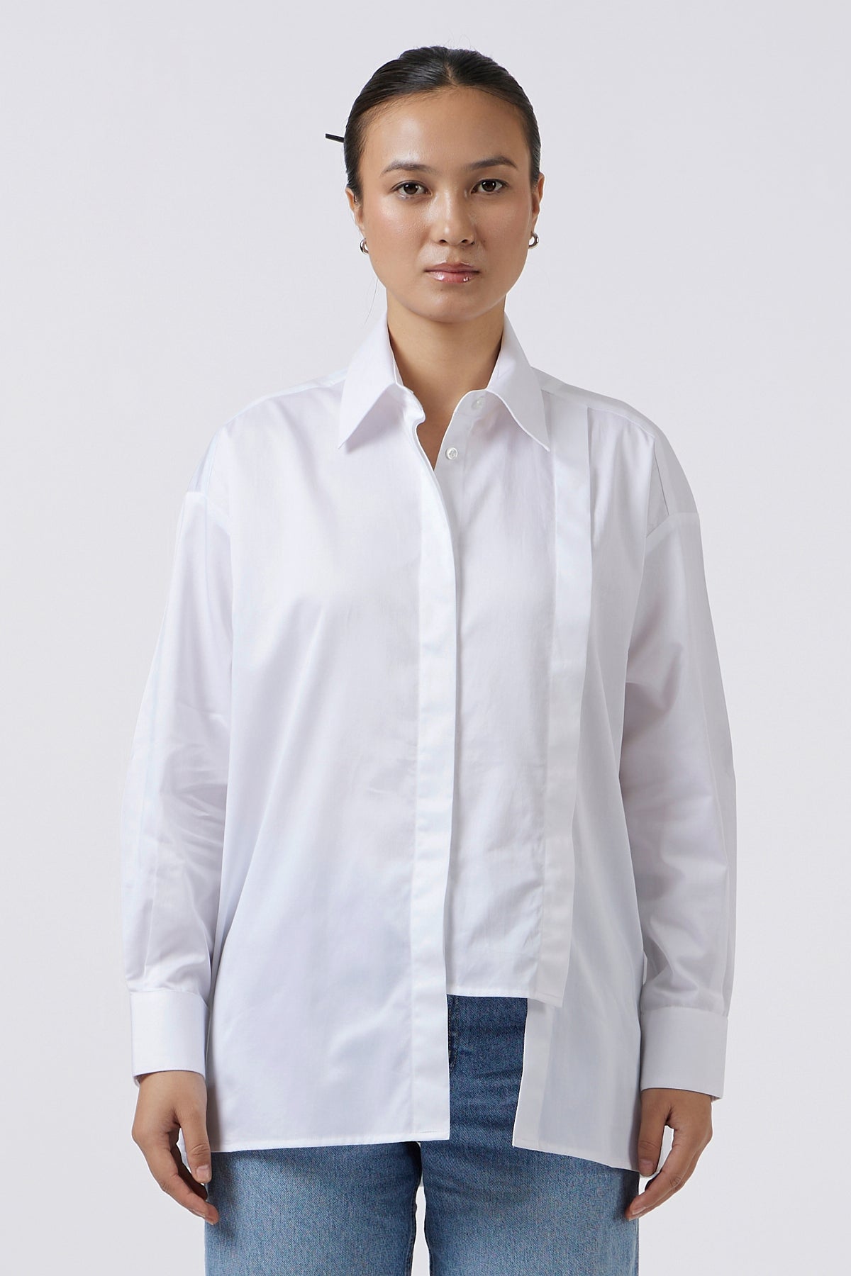 An elevated interpretation of the classic white shirt, this design highlights the art of precision tailoring. The two-button placket adds refined distinction, while full sleeves and a sculpted classic collar create a silhouette of effortless grace. Crafted from premium fabric with a subtle sheen and luxurious drape, it embodies the quiet power of understated elegance. A versatile piece that transitions seamlessly from day to evening, becoming a cornerstone of the modern wardrobe.